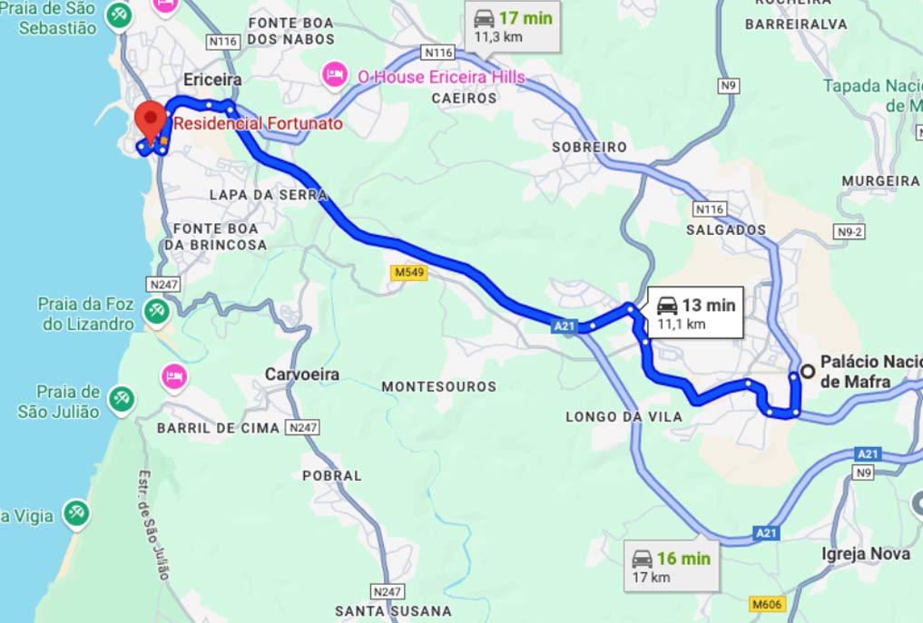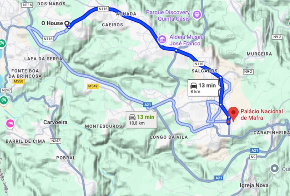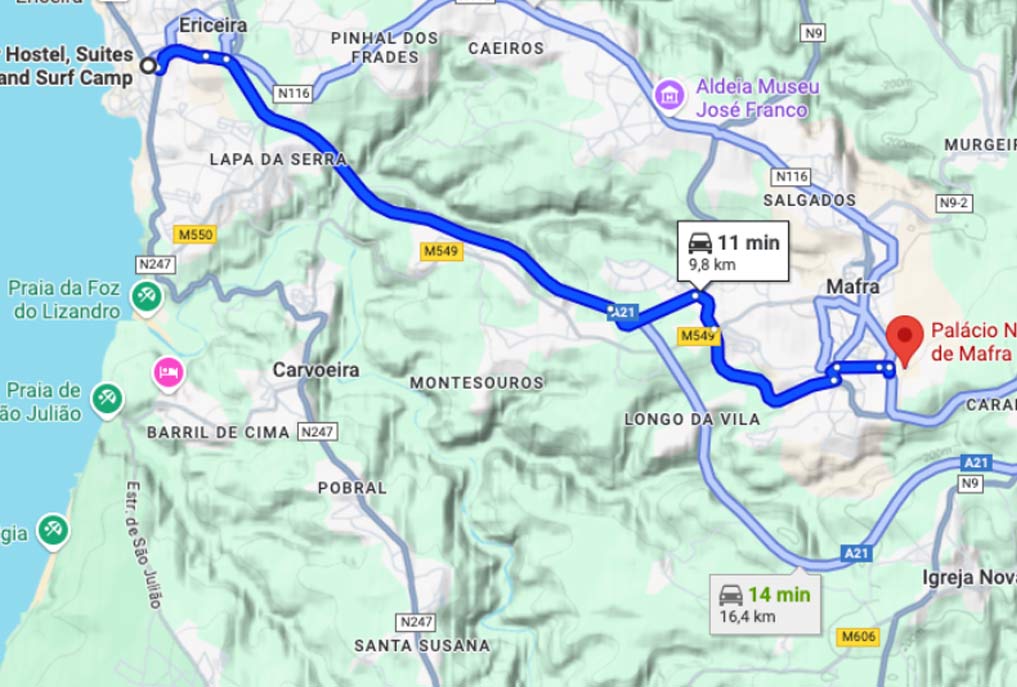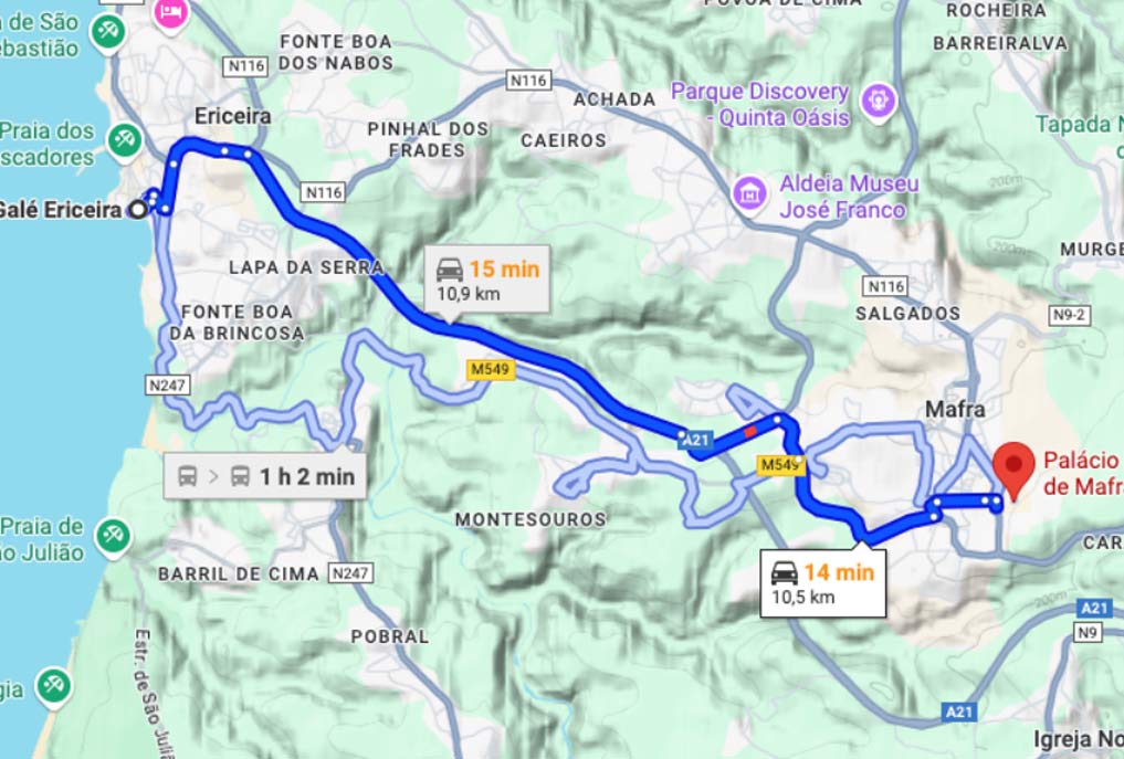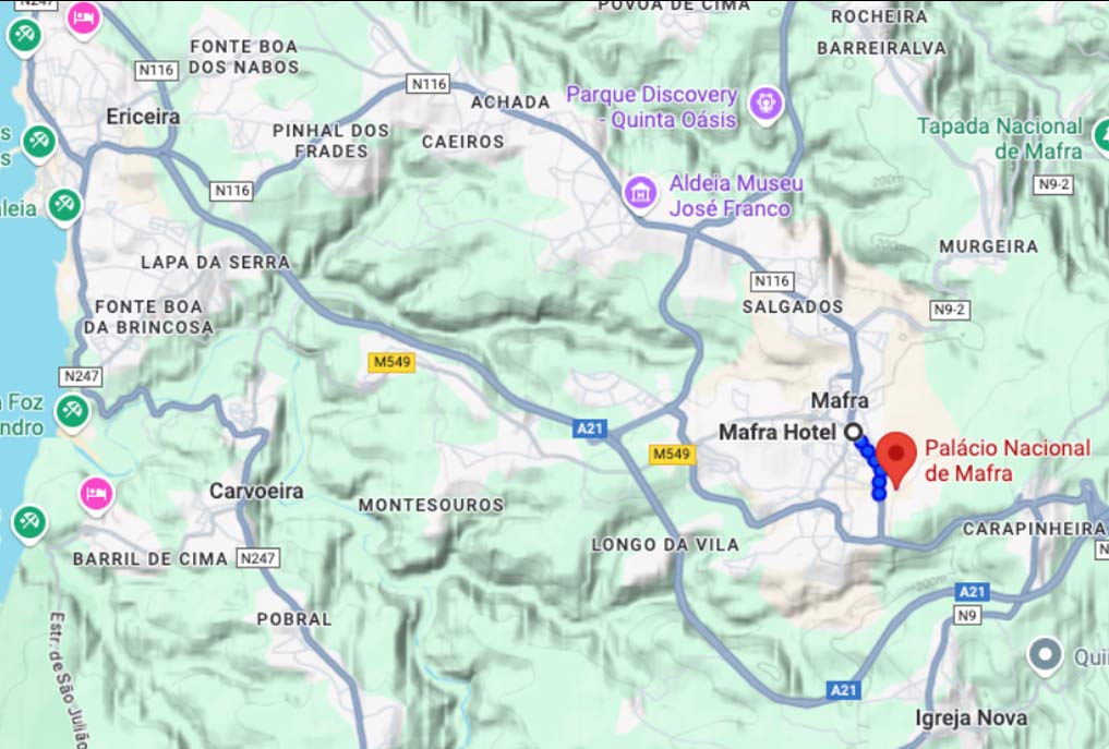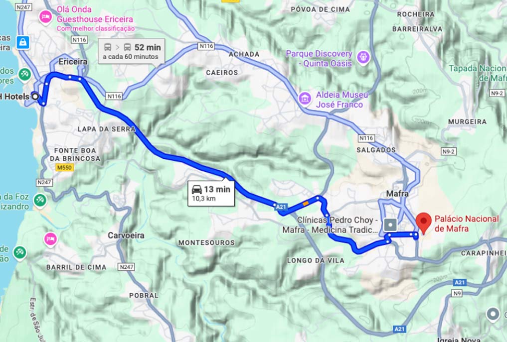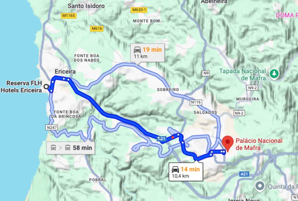The best route is via the A8 highway. Take Exit 5 (Malveira/Mafra) and then join the A21 towards Mafra.
