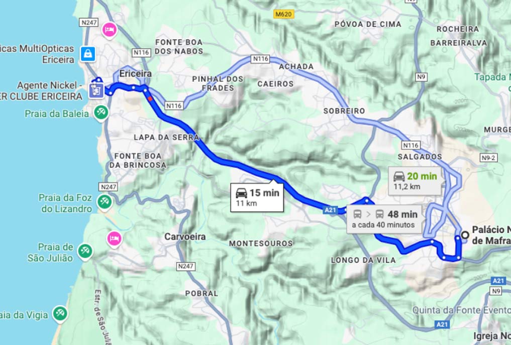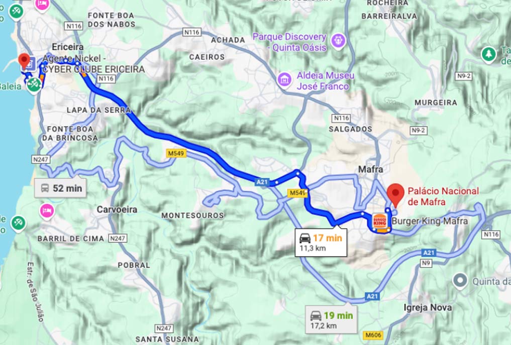 Option B: Take the metro to “Alameda” station, change to the green line towards “Telheiras,” and get off at “Campo Grande.” From there, take a bus to Mafra. More information about the metro here.